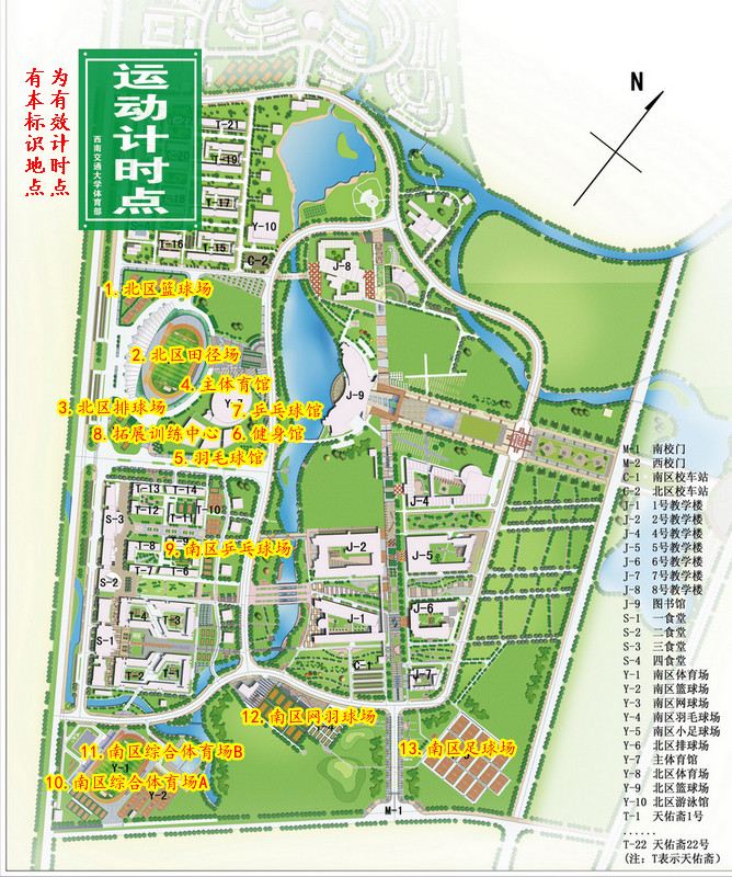 10、南区综合体育场A;11、南区综合体育场B; 12、南区网羽球场; 13、南区足球场。
