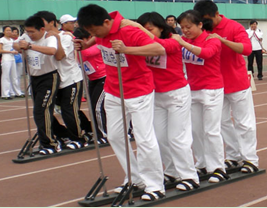 ★比赛方法:4人为一队站在协力竞走上前行,赛程30米,用时最短者为胜。