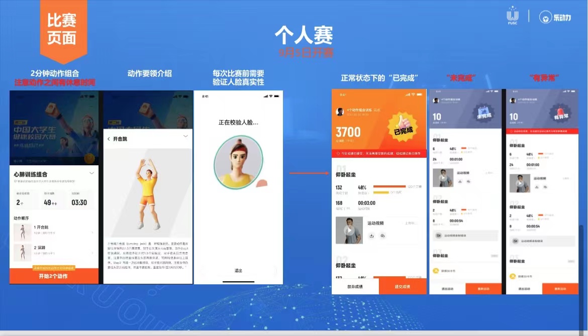 1、比赛项目:比赛为个人赛。采用乐动力APP提供的开合跳、深蹲、原地跑、海星跳、原地蛙跳等健身动作。