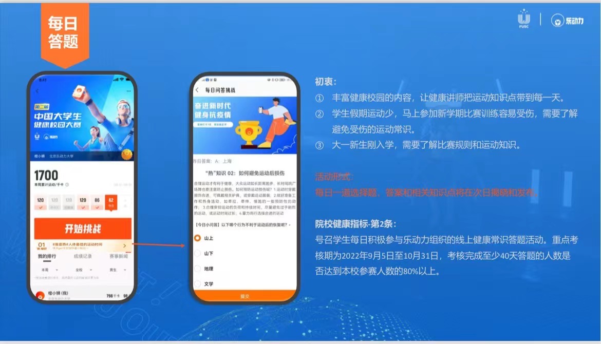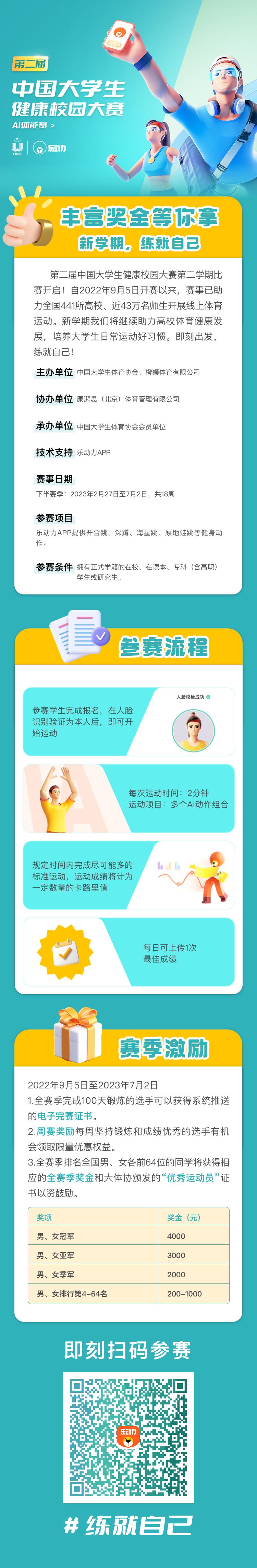 10、注意事项:报名参赛的同学,务必做好身体监控,根据自己当时的身体状况完成比赛内容;身体若有不适状况,应及时停止并作调整和休息;考虑到学生刚结束假期,部分同学阳康归来,第一周和第二周比赛都是幅度较小的动作。希望同学们趁这两周时间慢慢恢复体能,注意运动安全。