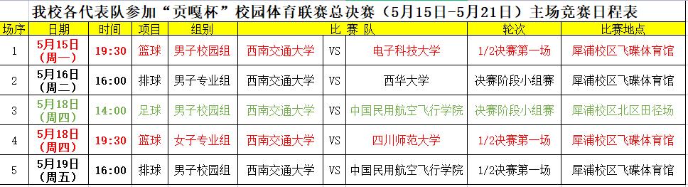 制。现将我校各代表队本周(5 月15 日-5 月21 日)主场竞赛日程公布如下,望广大师生空余时间到赛场为我校健儿加油助威!