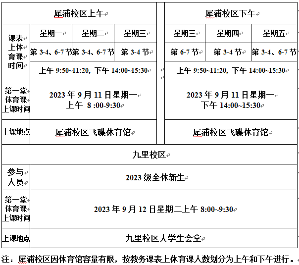 2、九里校区2023级全体同学按照上课时间,统一在排球场集中,按个人所选体育运动项目,以教学班为单位集合,再由任课老师带到上课地点去上课。