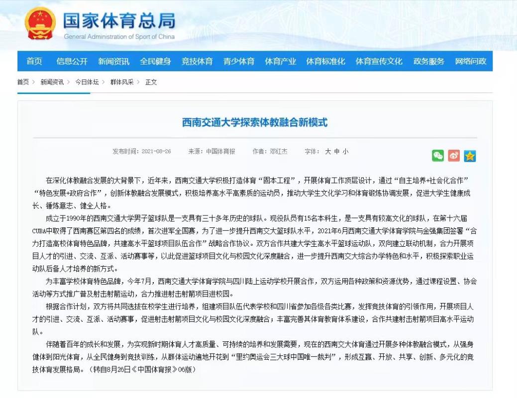 通过“自主培养+社会化合作”以及"特色发展+政府合作"创新体教融合发展模式,积极培养高素质的高水平运动员,推动大学生文化学习和体育锻炼协调发展,促进大学生健康成长、锤炼意志 健全人格。