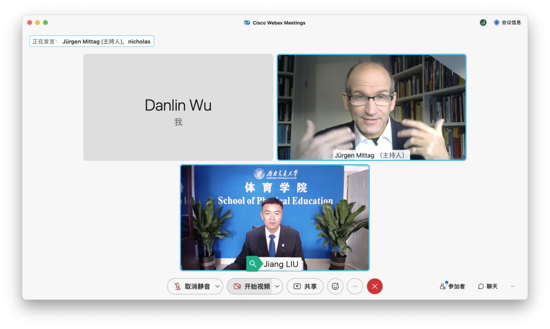 习近平总书记在全国教育大会上指出“扩大教育开放,推进教育现代化,要聚焦世界科技前沿,同世界一流资源开展高水平合作办学,把质量高、符合需要的引进来”。为加强与世界一流体育大学的交流与合作,提升学院国际化水平和人才培养质量,11月11日下午,PA视讯官网入口与德国科隆体育大学欧洲体育发展与休闲研究学院召开了线上合作交流会议。PA视讯官网入口院长刘江、党总支书记潘喆、副院长张春燕、高平、办公室主任高海平、刘媛粒老师、卢立宝老师;德国科隆体育大学欧洲体育发展与休闲研究学院院长Jürgen Mittag教授出席本次会议。