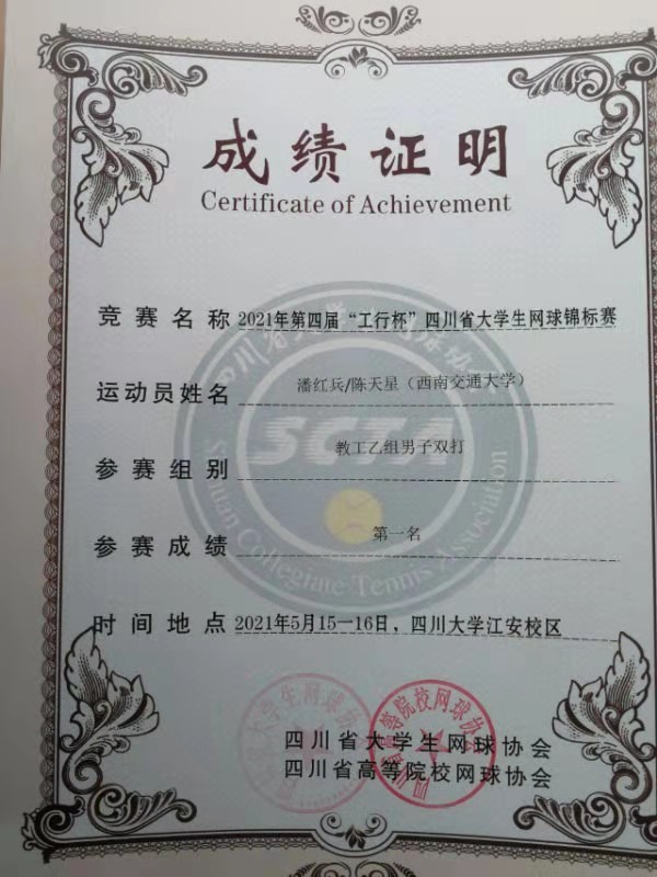 2021年5月16、17,21、22日,四川省大学生网球锦标赛、首届成渝双城经济圈高校网球邀请赛分别在四川大学、四川轻化工大学举行,两项赛事分别吸引来自全省41所高校的718名运动员和233名运动员。体育工作部潘红兵老师代表交大参加教工乙组男子双打比赛,经过激烈对抗,最终都获得了冠军。