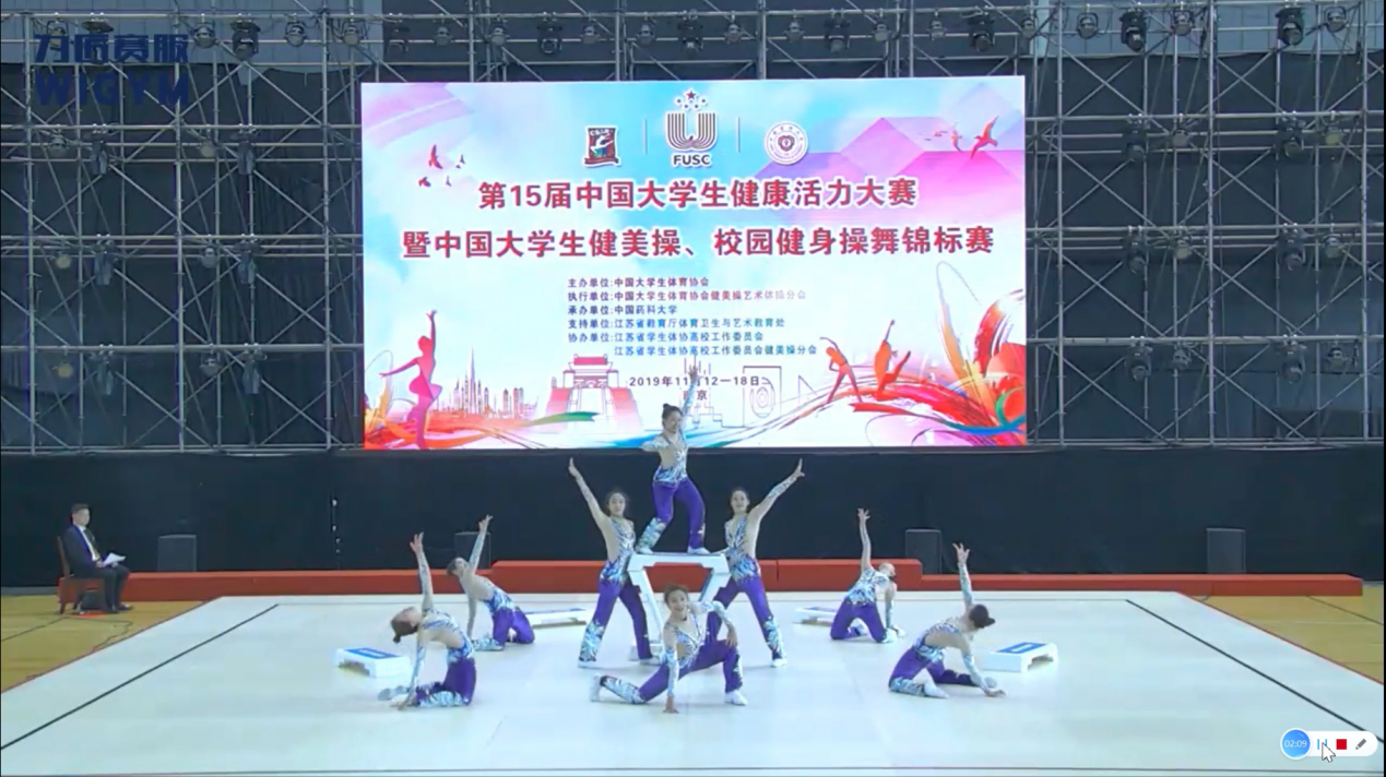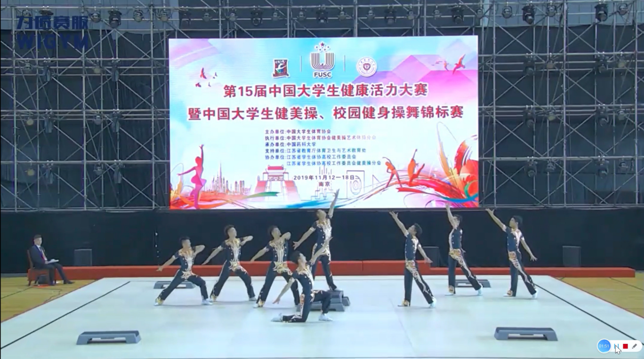 2019年11月12日至17日,由中国大学生体育协会主办、中国大学大学生健美操与艺术体操协会执行、中国药科大学承办的“第15届中国大学生健康活力大赛暨中国大学生健美操校园健身操舞蹈锦标赛”在六朝古都南京,中国药科大学顺利举行。我校健美操高水平运动队由张问宇老师担任领队,何江明、李鸿、刘媛粒老师担任教练,共派出24名队员参赛,取得了高水平自选女子有氧踏板项目第二名、混合有氧踏板项目第二名、男子有氧踏板项目第三名、竞技五人操项目第七名的好成绩。另外,何江明老师被大赛评为优秀教练员。