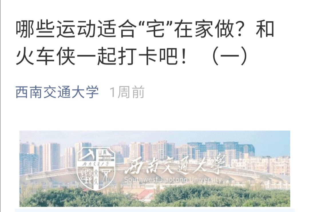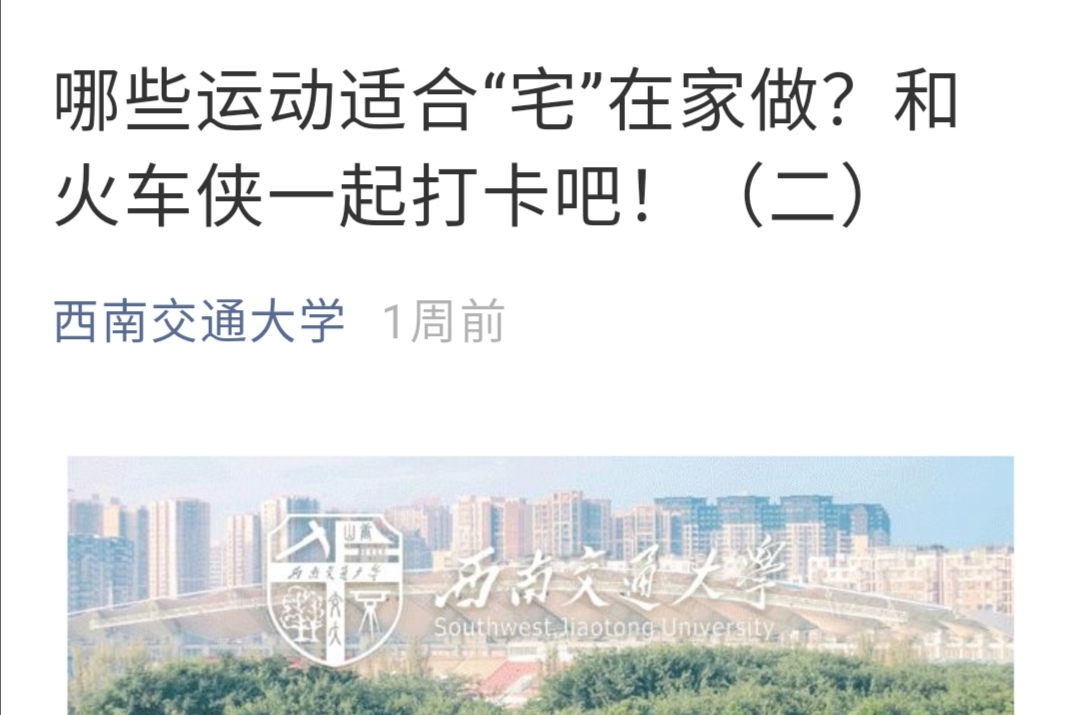 疫情与春节并行,这个假期注定不一般,但是交大体育人未雨绸缪,体育部教师利用假期时间为大家准备了热身操、体能练习、太极养生等14个“足不出户就能锻炼身体的运动视频”。分别以《哪些运动适合宅在家做?和火车侠一起打卡吧!》等一系列居家健身方法,推送在PA视讯官网入口官微上,帮助广大师生进行科学体育锻炼。