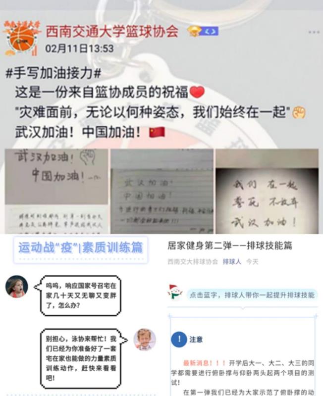 除了通过减少外出、勤洗手、开窗通风、酒精消毒等日常生理卫生手段抵御疫情外,通过体育运动强身健体,增强自身免疫力,也有利于防范疫情及减少自身被感染的风险。为此交大体育人在疫情期间一直忙碌着,以“抗疫情、动起来”、“抗疫情、小运动、大健康”、“疫情来袭、健康嗨起来”等主题撰写制作多篇操作性强、实用性强的教学视频文件,通过新媒体向全校师生推广,支持各协会进行“情系武汉仁爱中国”义捐活动。全校师生推广,取得很好的效果。