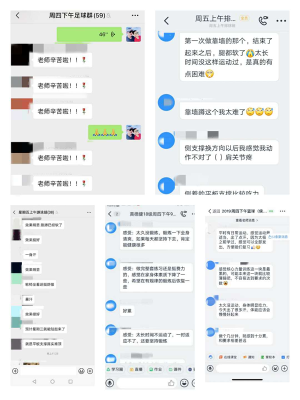 通过和各团队的及时交流和巡查中发现,老师们在课堂上传达精神、介绍课程、坚持不懈地做好技术讲解、纠错、教学进度安排、运动量的掌控及人文关爱,保持课堂适时互动,结束时还有作业的布置和课件资源的支持等。老师们在教学的岗位上坚持职业操守,兢兢业业的付出,换来了良好地教学效果,个别班级还出现了学生家庭成员参与其中的情况。运动锻炼的需求在师生间的交流中得以彰显,很多同学既表达了体能下降的现实和积极锻炼的期许,也给老师们的辛苦送上了问候!
