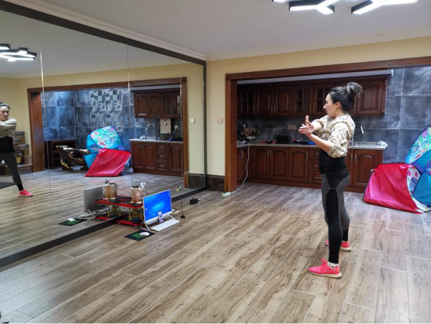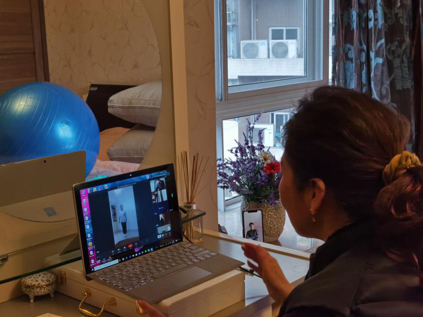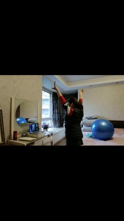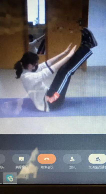 另外,在线上课程结束之前艺体教研室老师们也会带领同学们对身体素质进行强化练习并放松拉伸。身体素质练习的趣味性一直是运动舞蹈课程的素质练习宗旨。艺体教研室的老师们一边通过屏幕摄像头对学生的实时动作指导,一边与学生一起相互鼓励完成练习。运动舞蹈课程的线上教学并没有因网络而阻隔师生间课程参与的共同热情。