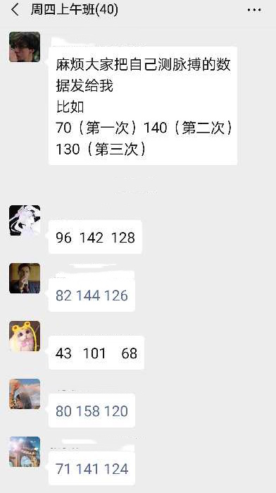艺体教研室“光影律动校园健身操舞”线上慕课学习与网络面对面实时指导教学都遵循科学性、娱乐性、有效性、严谨性原则。在线上直播课程开始前,艺体教研室的老师们会引导学生对其基础脉搏进行测试。之后,在课程开始35分钟左右再次引导学生对其运动量顶峰脉搏进行测试。最后在课程结束前再次引导学生对其脉搏进行测试。通过学生真实心率的反馈变化,教师可以把握课程节奏使动作设计达到运动负荷,从而