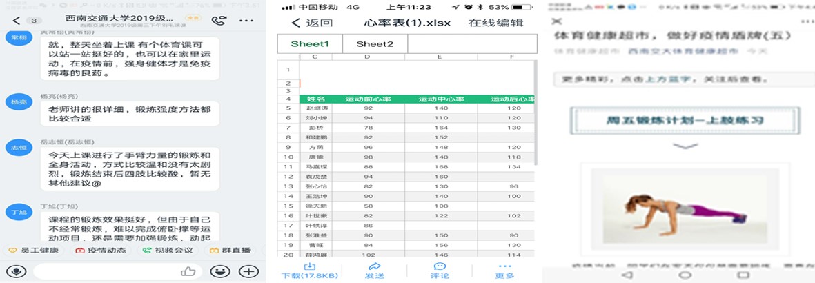 全校四个年级396个教学班,3万余名学生以线上超星直播课程、钉钉班群,备建微信群或QQ群为主要平台进行的实践课教学,出勤率达到96%以上,同步推进5期学生宅家课外自主锻炼内容效果显著。课程中签到点名、身体练习教学、师生互动交流、身体锻炼效果、课后锻炼材料的推送等方式得到了同学们的肯定。把以身体的运动为主,师生互动性交流强的室外运动移到线上进行的实践,取得了良好效果。