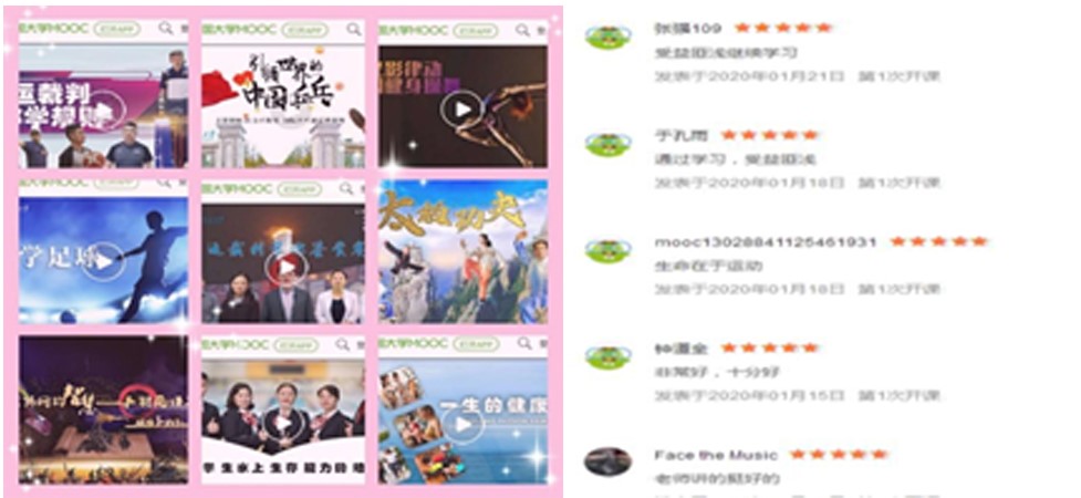 两周线上体育课程教学实践取得了良好的效果。开课第一周,在国内最大型慕课平台“爱课程”网———中国大学MOOC平台正式公开上线的10门体育慕课,第一周参与学习的学生总人数达52196人,学生反馈非常好。