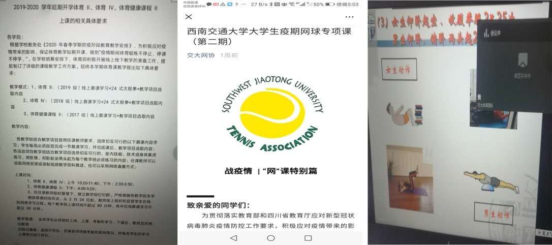面对此次疫情,体育部根据学校总体部署,在2月24日开课前一周对线上教学进行了分析和准备,首先,积极参与由教务处牵头、经省教育厅推向全省高校的线上讲座。其中,何江明副教授《共克时艰,疫情下大学生宅家如何进行科学锻炼》的直播讲座,参加人数达到了13000余人,反响较为强烈。其次,全力推送由部门教师团队前期建设的15门在线开放课程上线,开课前10门慕课成功上线。第三,对我校代表四川省参加全国大运会的运动队,在疫情期间通过钉钉和微信群开展线上训练,并对体育部组织编写的宅家锻炼方法内容进行总结和提炼,这些前期工作为体育课程实现线上教学提供坚实基础保障。