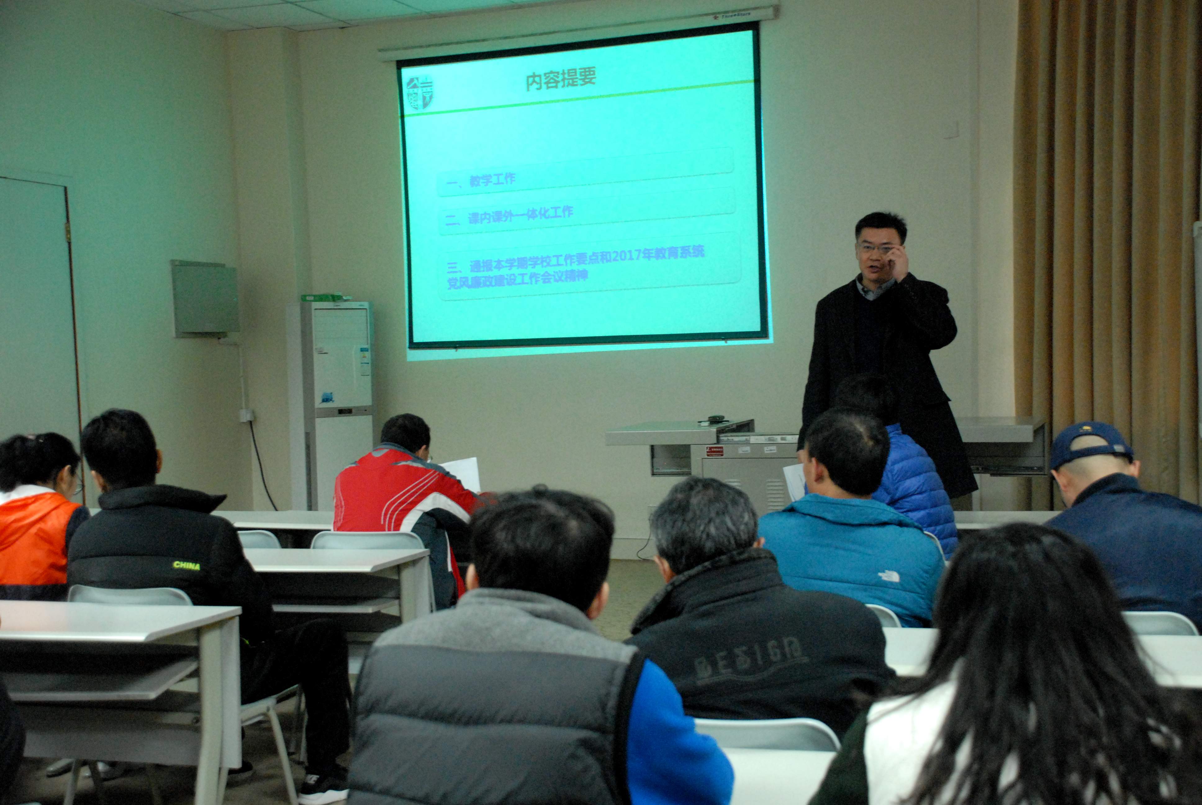 会上,刘江老师对开学一周来的情况做总结,并传达了学校部署十项具体工作安排精神。2017年是政治年,是学习年、落实年、改革年、质量年、攻坚年、稳定年。按照校长徐飞讲话部署,2017年,体育部全体教师须坚持党的领导,筑牢坚强阵地;践行五大发展理念,引领新发展;坚持战略定力,久久为功;坚持统筹兼顾,协调发展;坚持狠抓落实,攻坚克难;坚持落实责任,确保安全稳定等六大原则。
