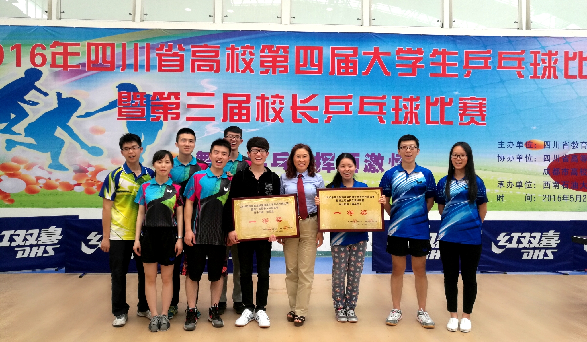 5月26日—5月28日,2016年四川省高校第四届大学生乒乓球比赛暨第三届校长杯乒乓球比赛在西南石油大学隆重举行。我校乒乓健儿在比赛中奋勇拼搏,成绩斐然。男子团体和女子团体均获得普通高校精英组团体一等奖,来自经济管理学院的张勤跃同学获得普通高校精英组女子单打第一名。