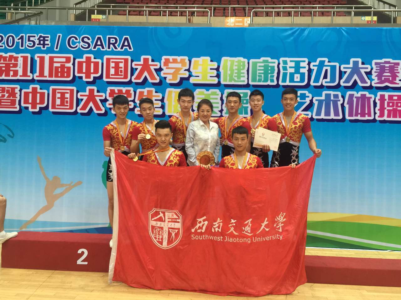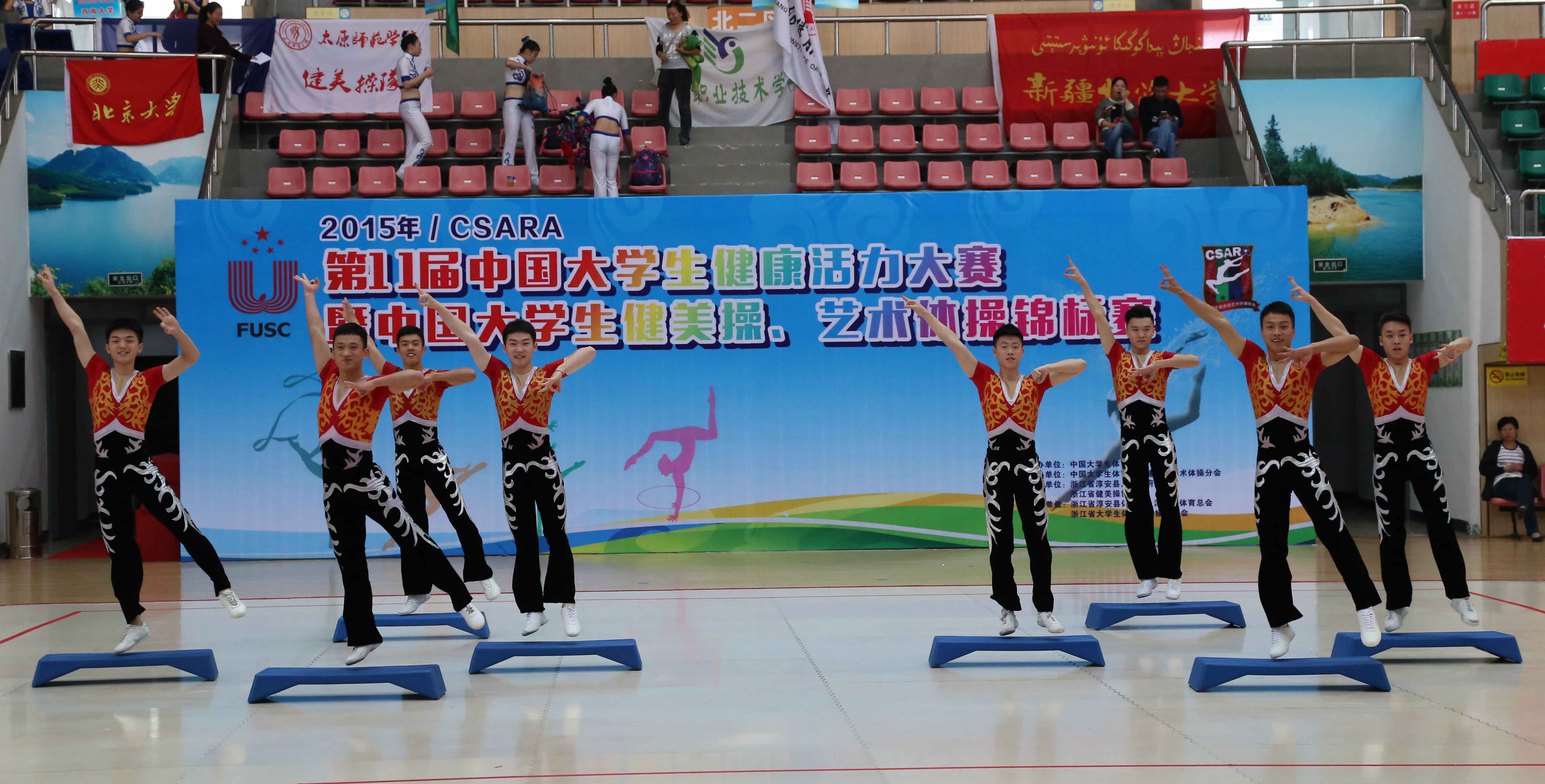 11月5日-11月7日,2015年CSARA第十一届中国大学生健康活力大赛暨中国大学生健美操、艺术体操锦标赛在浙江省淳安县体育馆隆重举行。我校健美操队在主教练李鸿教授带领下,在6号晚上的决赛中表现优异,夺得男子有氧踏板操比赛冠军。我校李鸿教授担任此次比赛裁判员,获得 “优秀裁判员”的称号。