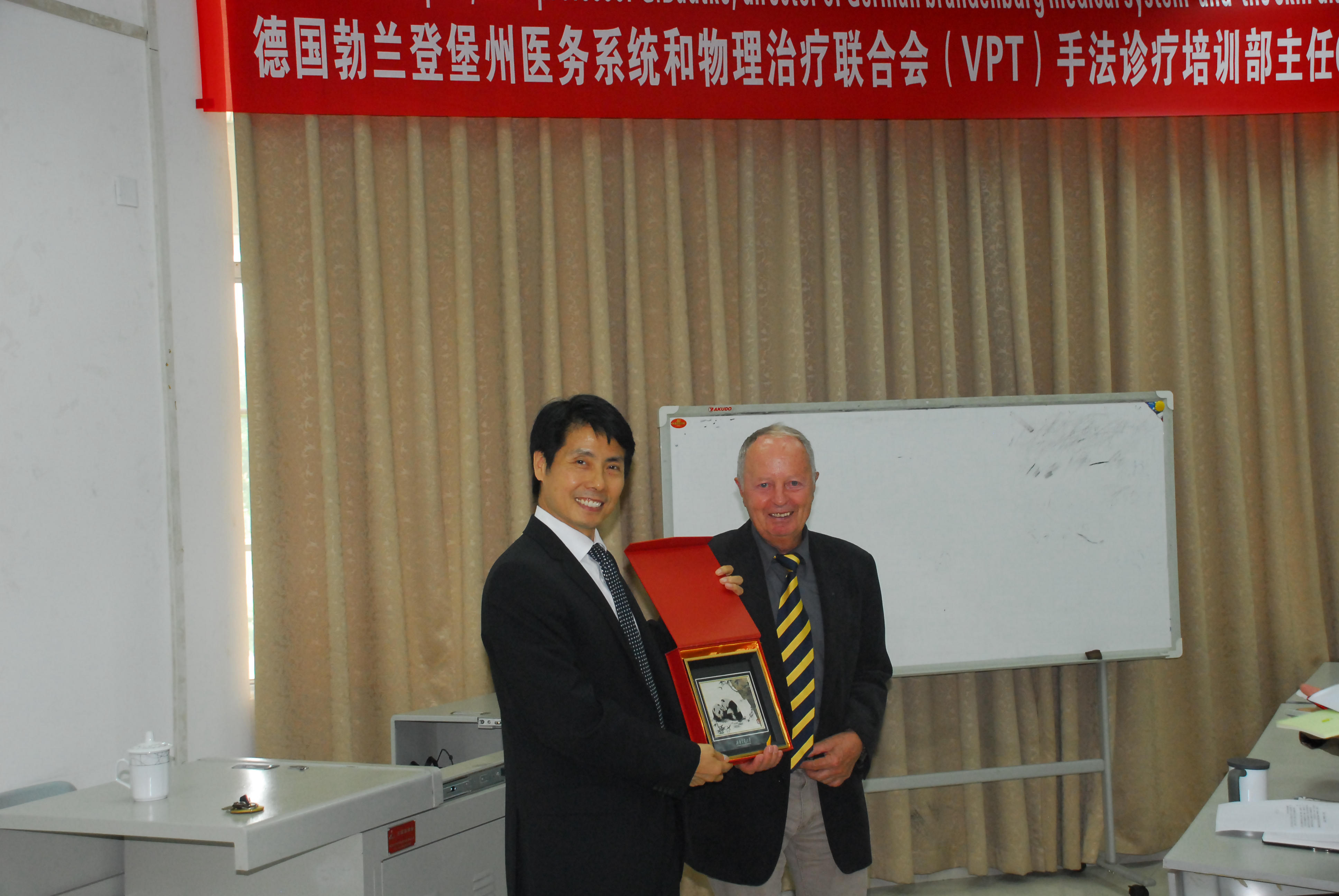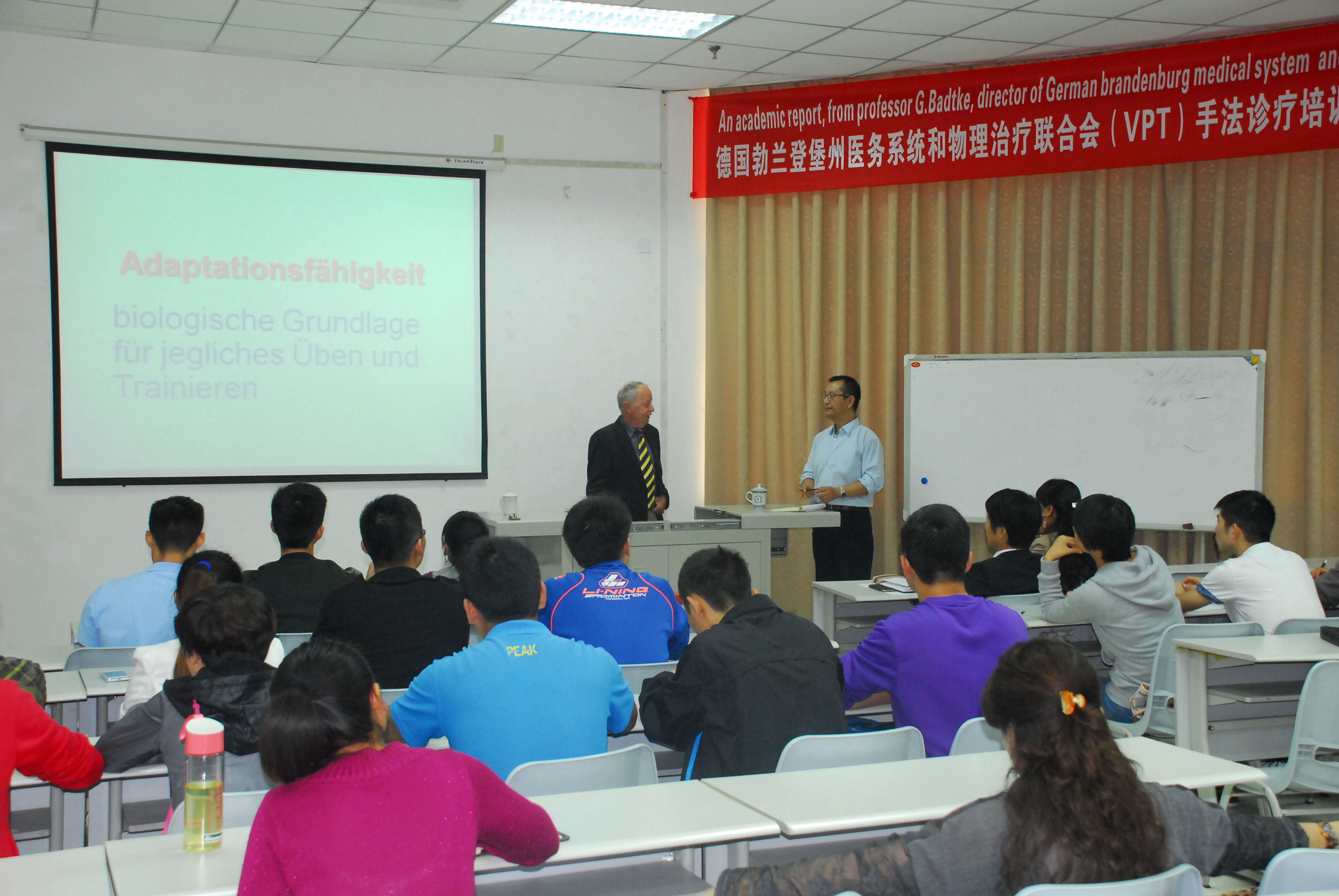 德国勃兰登堡州医务系统和物理治疗联合会(VPT)手法诊疗培训部主任巴德克(G.Badtke)教授曾任波茨坦大学运动医学学院院长,在运动医学领域具有较高水平,尤其擅长手法诊疗和整脊术。此次来西南交大,带来的是有关《运动器官的疼痛及诊疗手法》的专题讲座。