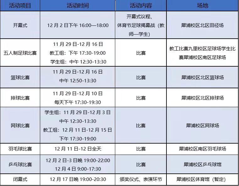 4、活动项目:体育节开、闭幕式、以“运达杯”冠名的篮球赛、排球赛、足球赛、网球赛、乒乓球赛和羽毛球赛。