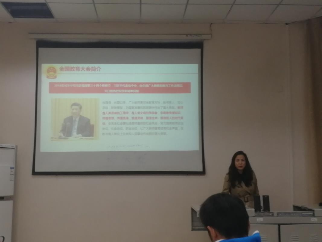 根据“不忘初心、牢记使命”主题教育安排,10月31日下午4点,体育部书记潘喆为全体教职工讲授专题党课。潘喆书记围绕“解读全国教育大会讲话精神,践行教师的初心和使命”为题作专题报告,深刻阐述了教育在新形势下承担的历史使命,对体育部如何践行初心使命提出了具体要求。
