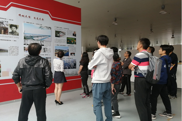 在校史馆二楼“交通强国红馆”第一展厅,讲解员首先向大家介绍了交大发展的第一篇章“风雨沧桑,夙愿丹心”,大家观看了大量图片和文字,了解了我校“严谨治学,严格要求”的双严传统以及优秀校友的杰出事迹,包括:在五四运动、抗美援朝等战役中挺身而出为革命做出贡献的校友们事迹;在抗战时期研究建造大桥、抗战公路、运输机,全力支持抗战的校友们的英雄业绩等等。在交大发展的第二篇章“科教兴国,崛起赶超”中,讲解员带领大家重温了交大人在中华人民共和国成立七十年以来对中国轨道交通的发展做出的重要贡献和辉煌成就。
