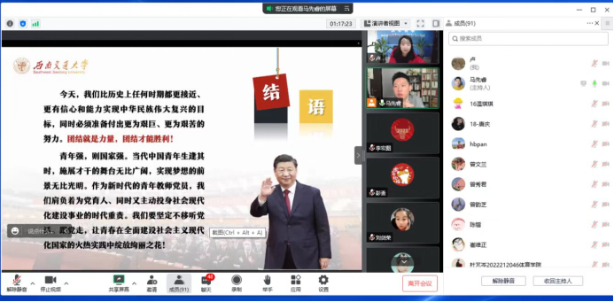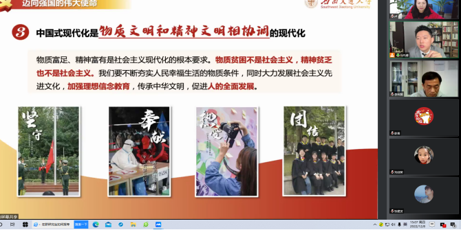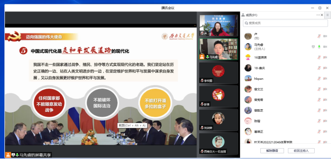 在PA视讯官网入口党委潘喆书记的主持下,通过线上课堂的方式,特邀请我校马克思主义学院形势政策教研室主任马先睿老师为PA视讯官网入口全体师生进行了二十大精神的传达。马老师详细介绍了党的二十大报告的主要思想内涵,阐明此次大会的主题“高举社会主义伟大旗帜,全面贯彻习近平新时代中国特色社会主义思想,弘扬伟大的建党精神,自信自强、守正创新,踔厉奋发、勇毅前行,为全面建设社会主义现代化国家、全面推进中华民族伟大复兴而团结奋斗!”;马老师分别从气象万千的伟大时代、理论创新的伟大境界、迈向强国的伟大使命三个方面诠释了二十大报告的主旨要义,并结合体育强国建设、如何加强体育工作、怎样做好体育课程思政教学等方面,给全院师生做了深入浅出、透彻生动地辅导,讲述了几十年来我国体育事业、体育产业、体育实力等方面成绩斐然跃升与综合国力不断强大的关系密不可分