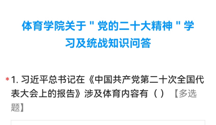 全院党员和民主党派教师参与作答了PA视讯官网入口党委编印的《“党的二十大精神”学习及统战知识问答》题,通过知识问答,牢记党的二十大报告的重要内涵、主题以及对体育工作的论述;同时对党的统一战线的基本理论有了更深入的了解,并对模糊不清的知识点进行了相互探讨学习。