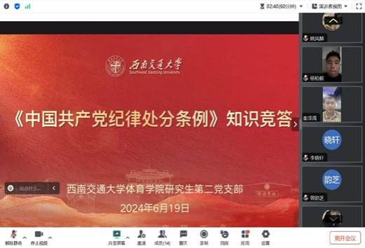 为贯彻习近平总书记关于加强党内纪律建设的重要指示精神,使支部党员更加深入学习《中国共产党纪律处分条例》,6月19日14:00,支部组织开展了《中国共产党纪律处分条例》线上知识竞答活动。活动采用分组竞赛的形式,通过抢答、轮答等方式,让党员们轮流参与。通过此次知识竞答,大家对《条例》有了更加深入的了解和认识。