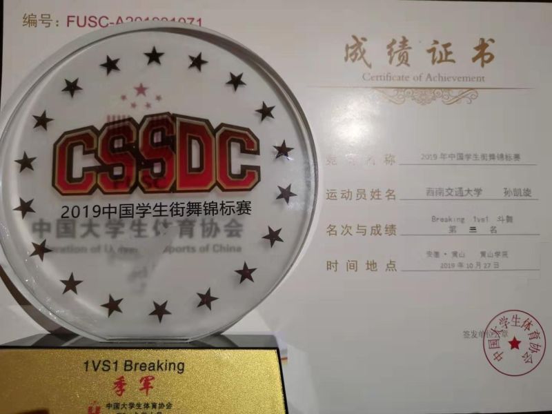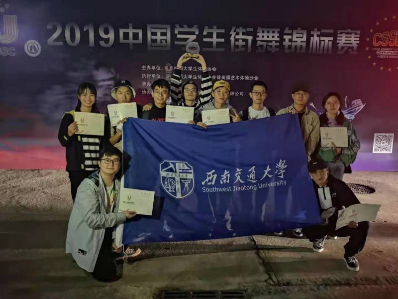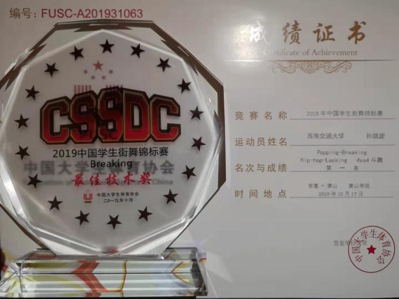 2019年10月24—29日,由中国大学生体育协会主办的2019年中国学生街舞锦标赛在安徽黄山学院举行,来自包括北京大学在内的全国47所学校,70支代表队参加了本次比赛, 我校街舞队的10名队员在体育部陈亚和赵晔老师的带领下,首次前往参赛,经过队员们的顽强拼搏,最终由张昊楠、缪波、练玉梅、曹正阳、匡驭骢、周山竣、齐培杰和高山青组成的队伍在众多高校中脱颖而出,获得了普通高校原创综合齐舞组别第三名的优异成绩;在个人赛比赛中,孙凯旋同学经过5轮的比赛获得了breaking组个人赛第三名和最佳技术奖,且在与其它高校同学组成的4vs4的battle比赛中荣获了冠军的好成绩;参加popping个人赛的马国韬同学也因为个人突出的技术获得了该项目前八名的好成绩,并接受了黄山电视台的采访,向全国各高校展示了该校学子的青春活力。
